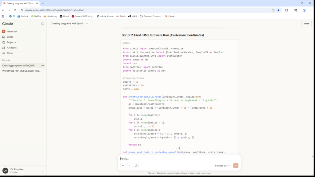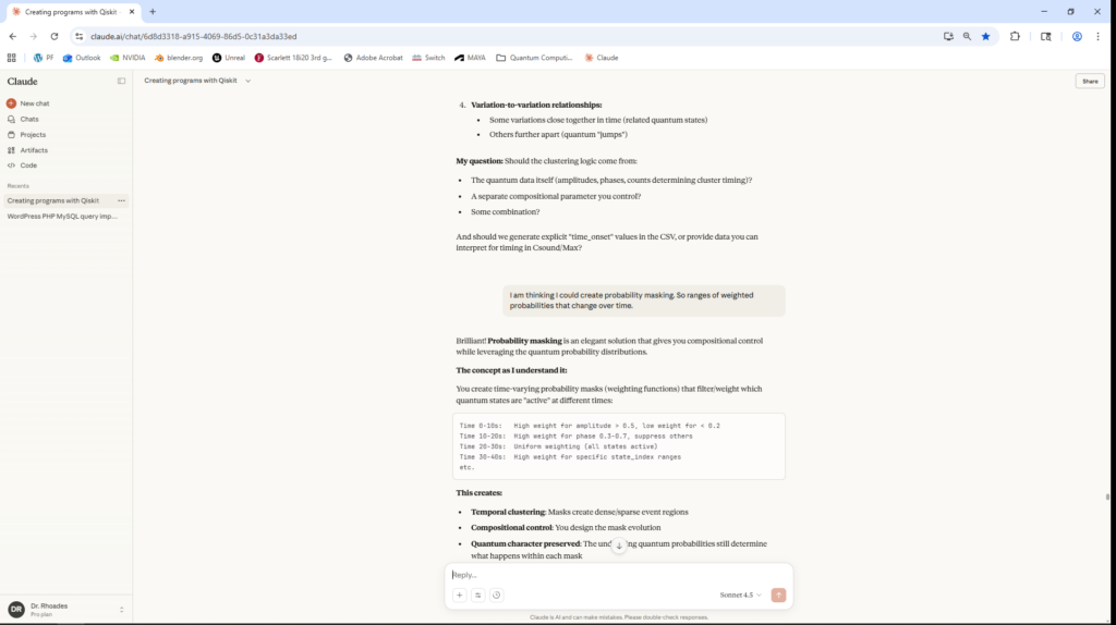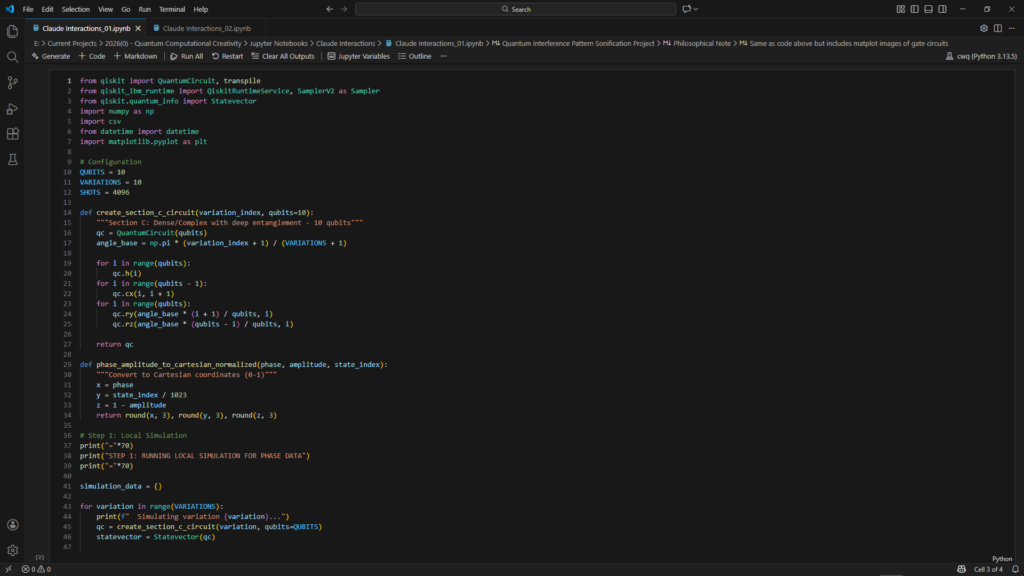 Initial project estimates anticipated months of study to achieve sufficient proficiency in quantum algorithm development. This timeline was significantly compressed through collaboration with Claude (Anthropic’s large language model), which served as a technical intermediary translating conceptual sonification goals into executable Qiskit code. This AI-assisted methodology enabled rapid iteration between conceptual design and implementation, though all algorithmic decisions, quantum circuit designs, and compositional choices remained under direct authorial control. The use of large language models in this capacity represents an emerging paradigm in computational creativity research, warranting acknowledgment as both a methodological tool and a subject for critical examination.