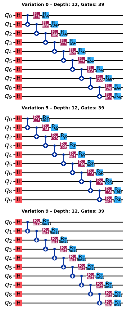 3. Parametric rotation: RY and RZ gates with systematically varied angles across circuit variations